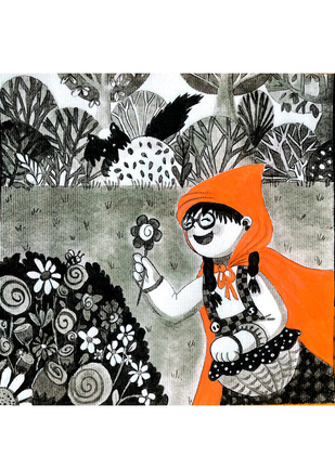 Técnica tradicional, fondo a gouache y figura en acrílico sobre plástico transparente.