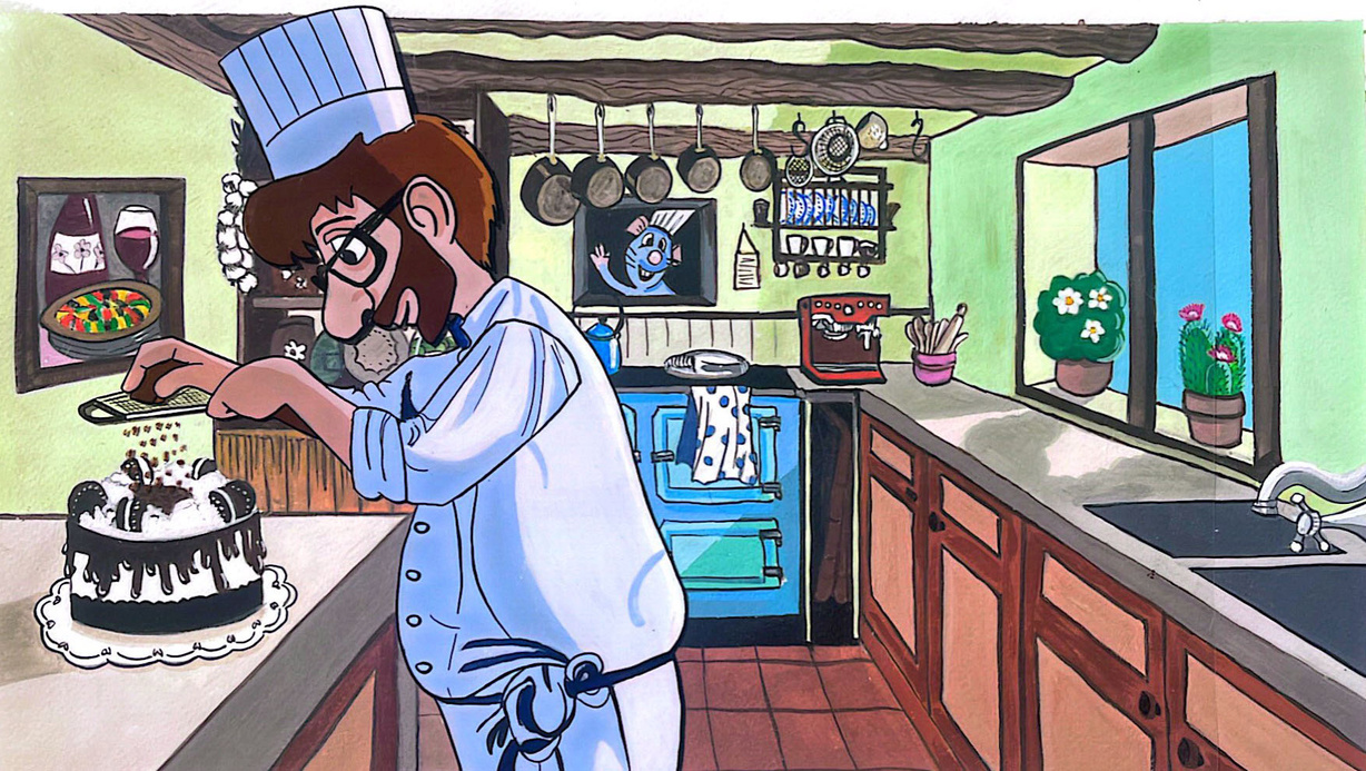 Lingüini está en la cocina de su casa preparando un pastel de cumpleaños.